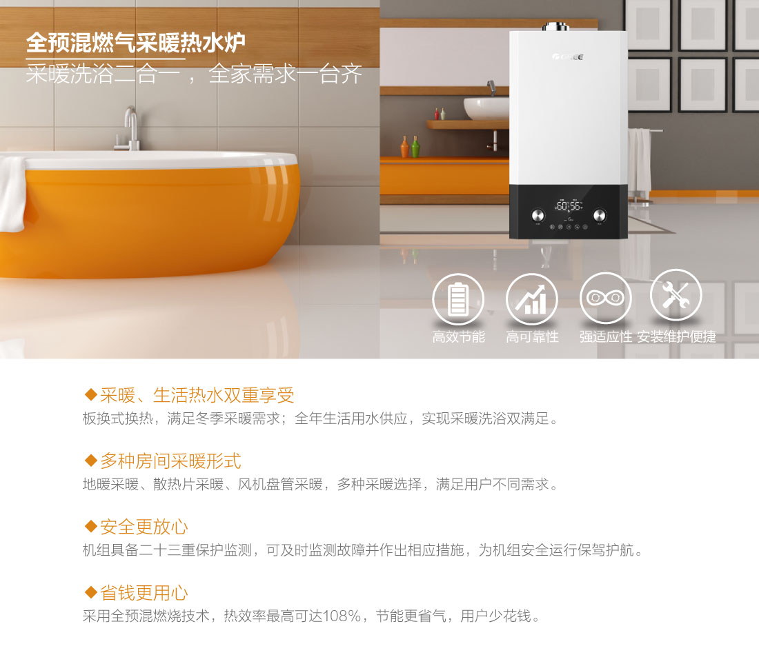 全預混燃燒結合雙寬域功率調節,節能恒溫,溫差在±0.5℃之間,保證熱水四季恒溫快速出熱水,減少水流浪費,生活水溫度35-60℃,采暖水溫30-80℃