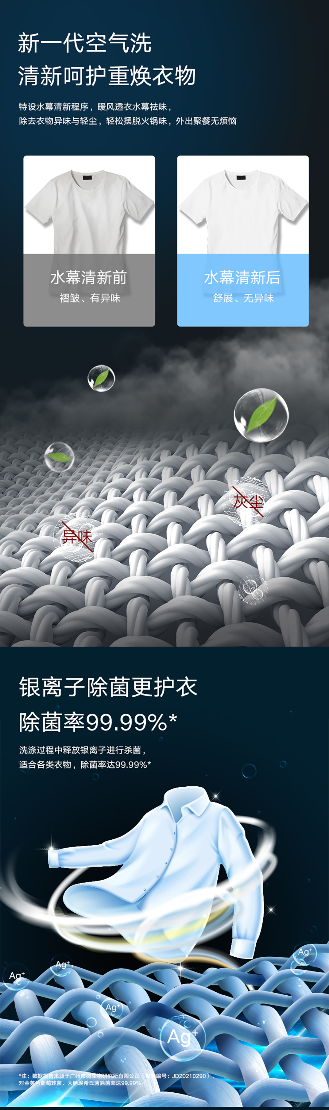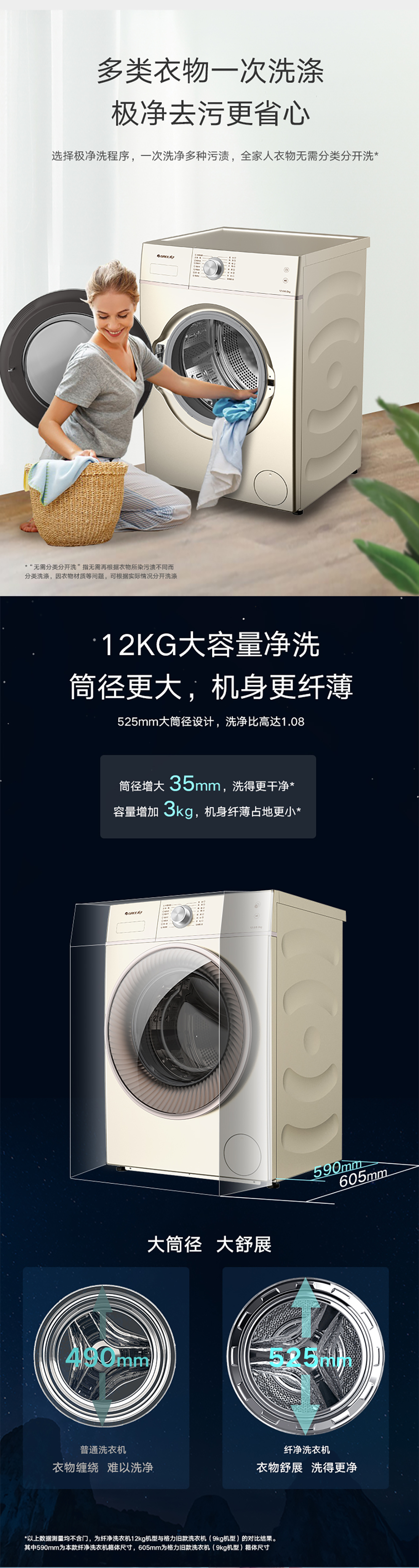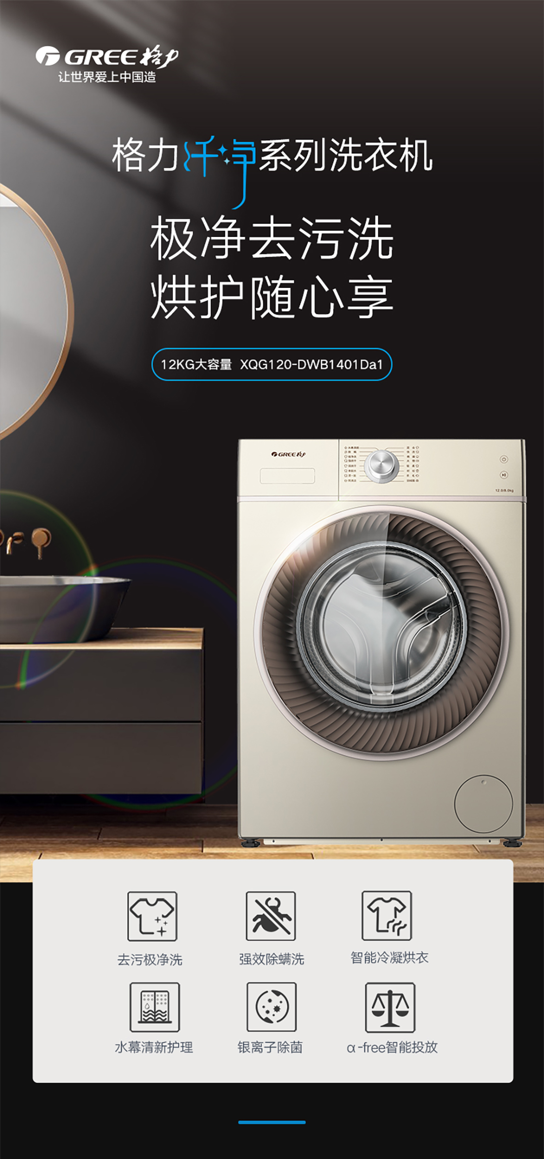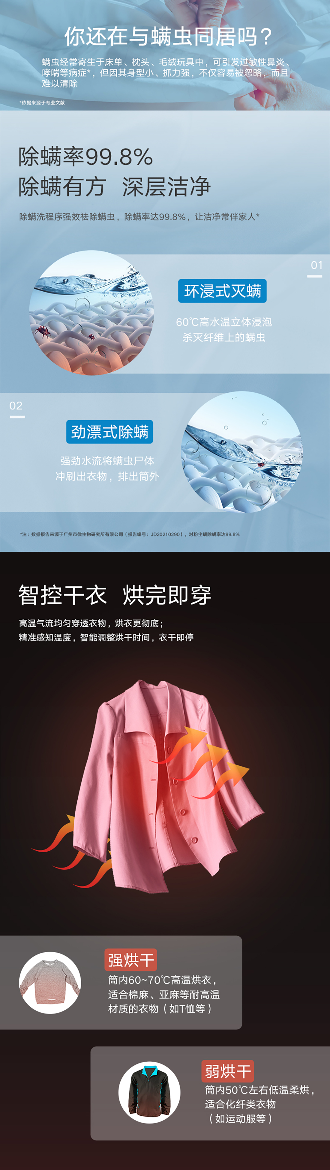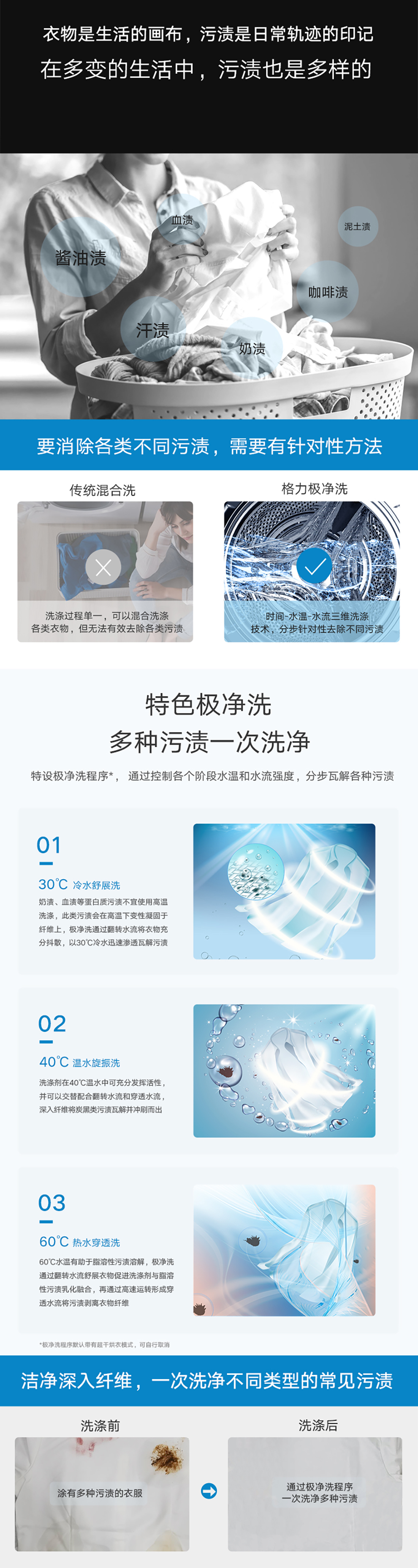 極凈去污,一次洗凈多類污漬;大容量,全家人衣物無(wú)需分類分開洗;洗烘一體,即洗即烘即穿.